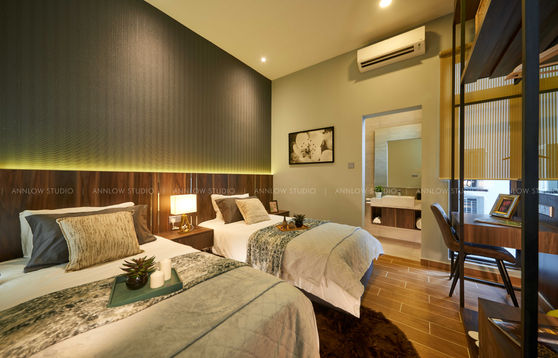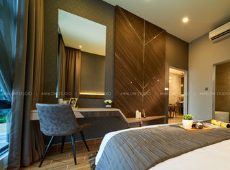 Hotel-style inspired, to be grand, to be modern and comfy for living. This is a fully furnished service apartment sales gallery, design concept to be contemporary modern, we play around with luxury marble with the contrast of the raw material like natural wood and cement texture. The highlight of the design is the use of exquisite material details blend in with the space which stand out throughout the interiors of this beautiful apartment, enhancing its luxury personality.